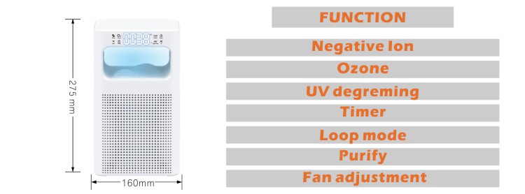 Function: Negative Ion, Ozone, UV degreming, Timer, Loop mode, Purify, Fan adjustment