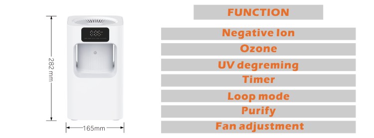 Function: Negative Ion, Ozone, UV degreming, Timer, Loop mode, Purify, Fan adjustment